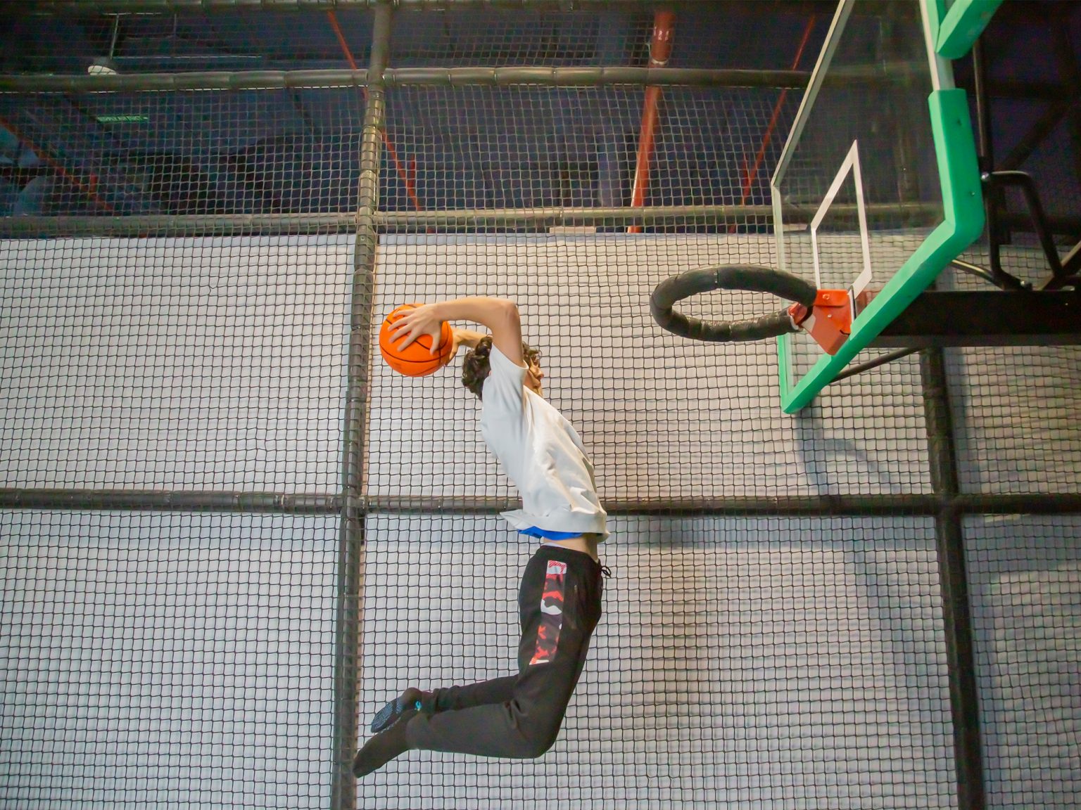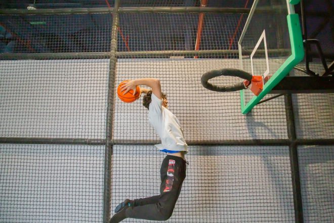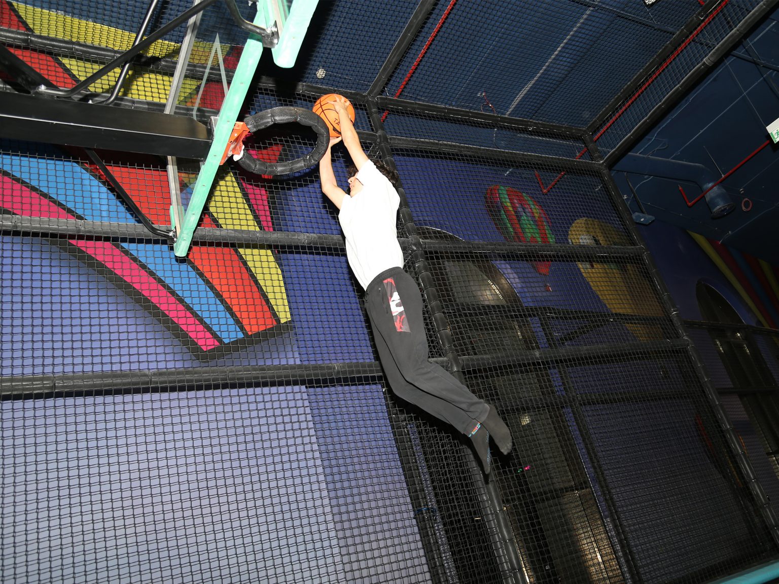 Don’t worry about getting hurt either, as the trampoline and basketball hoops are surrounded by soft floor mats and padded walls.
